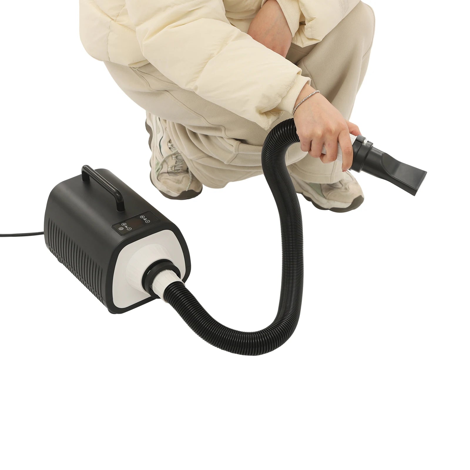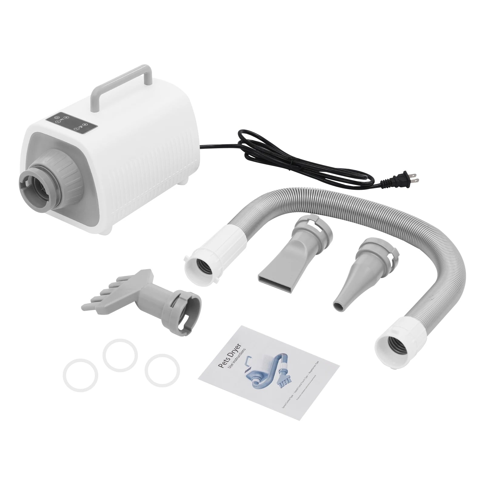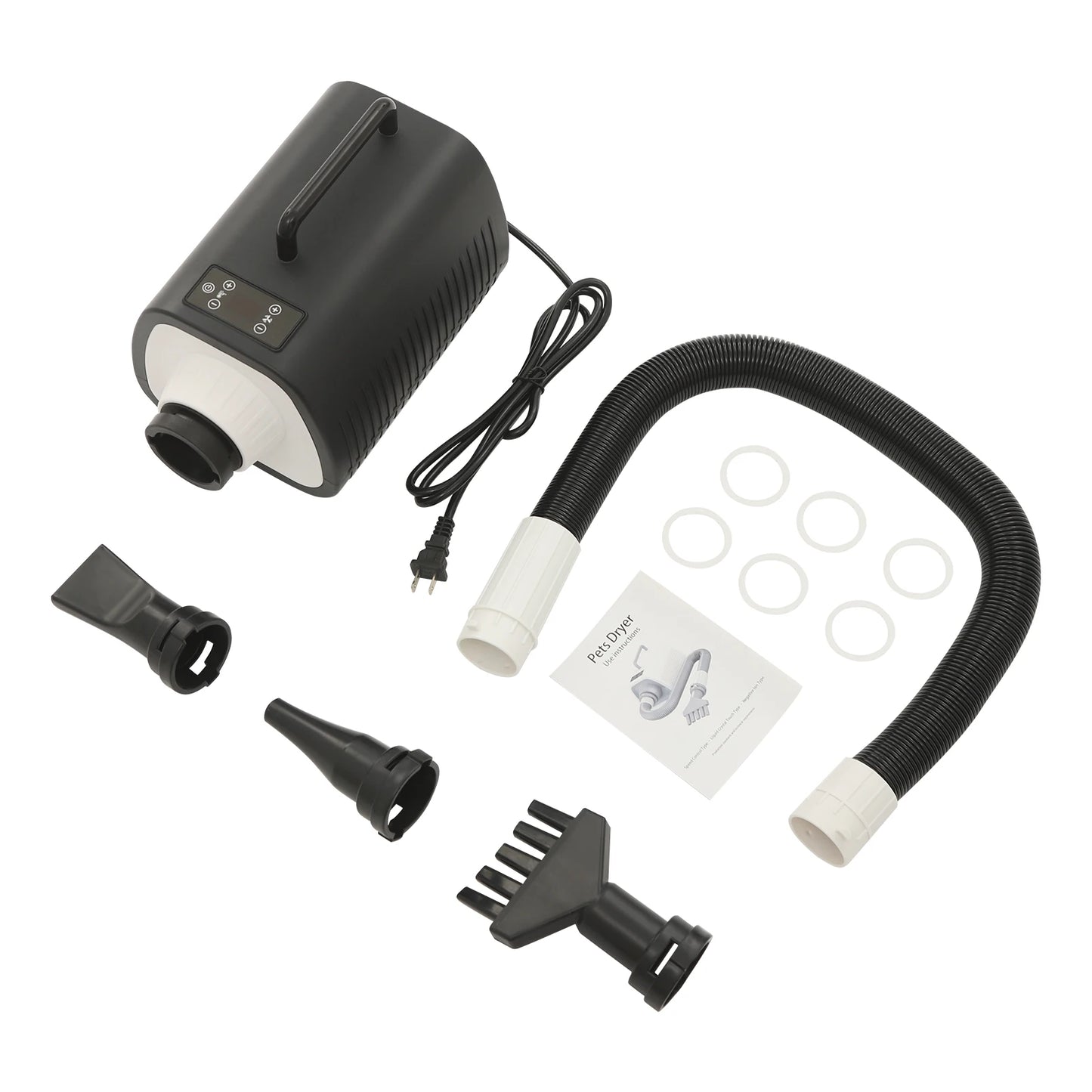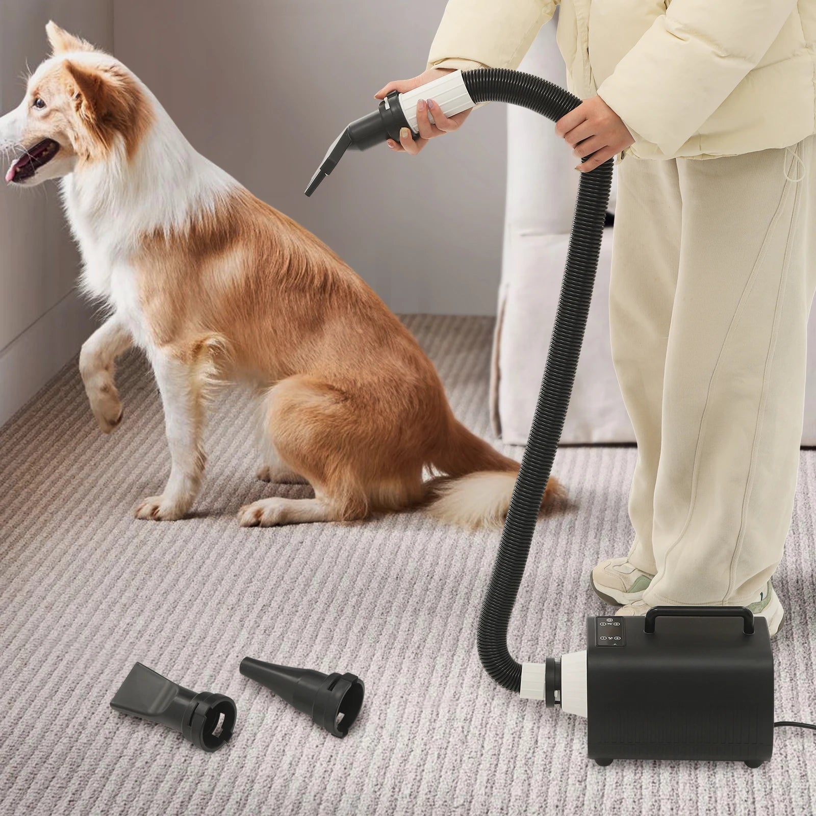 This pet hair dryer will provide an efficient, convenient, and comfortable hair-blowing experience for your beloved pets. It uses multiple speed and temperature adjustments, which enables you to easily test your pet's acceptance level and reduce their anxiety. In addition, the long blowing tube, 3 nozzles, and convenient handle allow you to use this product flexibly and easily, saying goodbye to hassle hair blowing.It is suitable for use in private homes, pet stores, pet hospitals and other places.