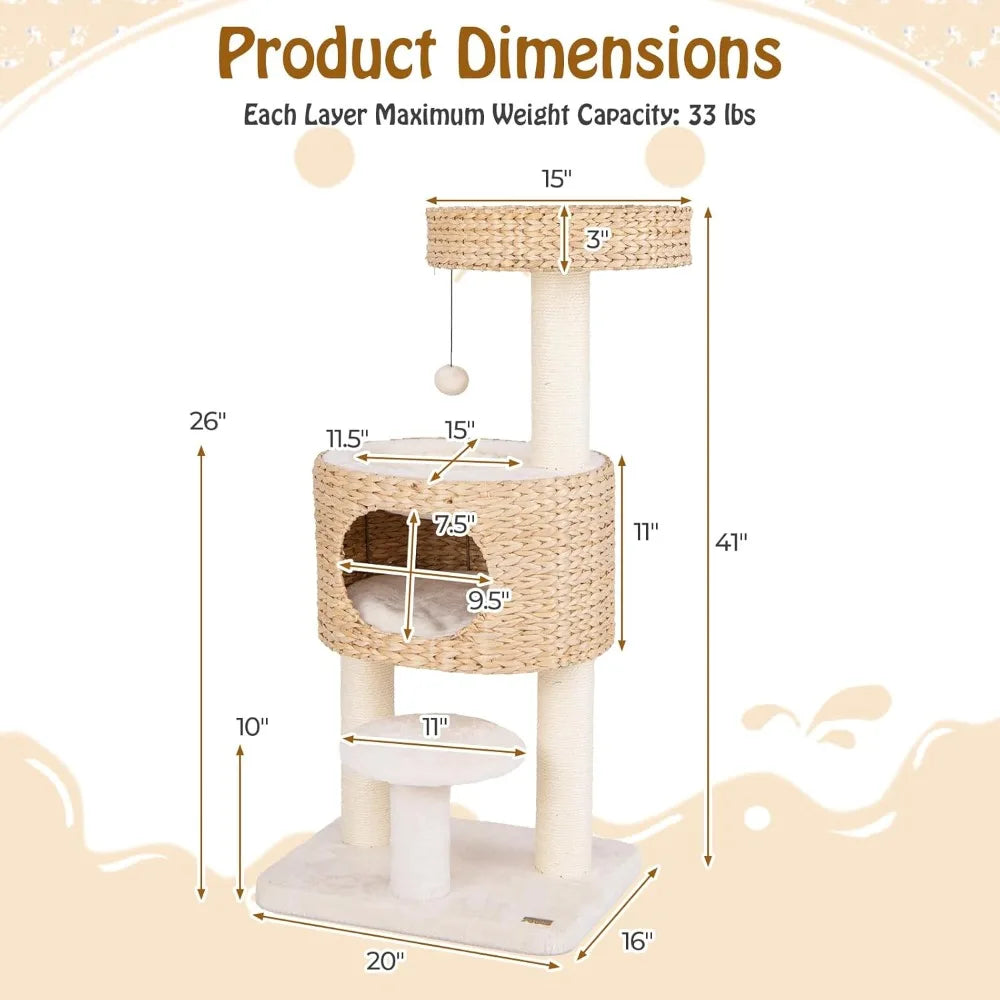 - Natural Appearance & Dimensions: The multi-level cat tree's natural appearance, along with its cattail surface and white plush, makes it an aesthetically pleasing addition to any home decoration. Measuring 20" x 16" x 41" (L x W x H), it offers spacious space for your cat's activities and is compact enough to fit comfortably in your home.